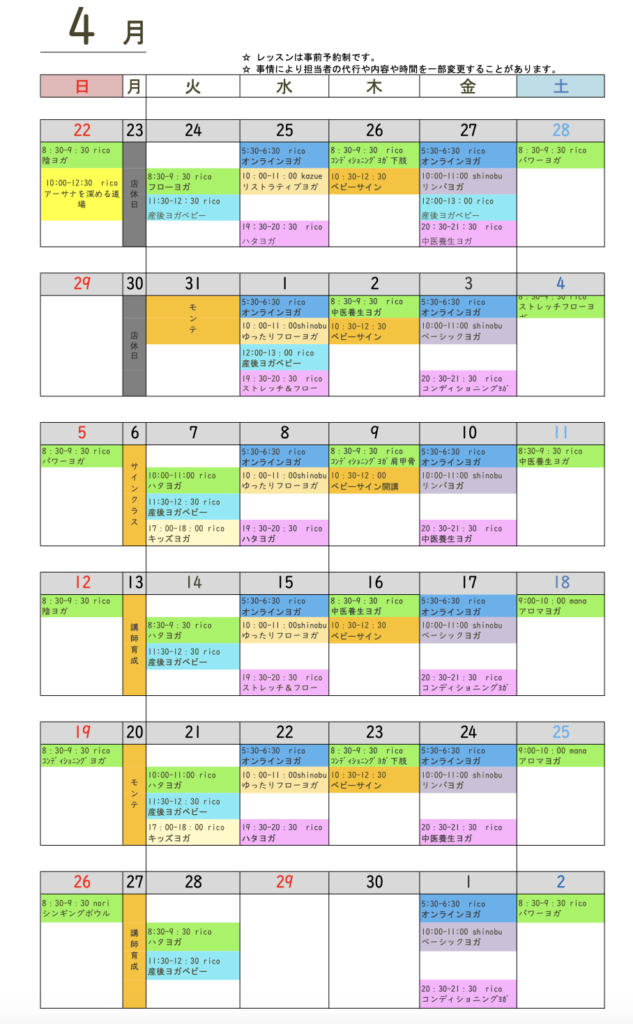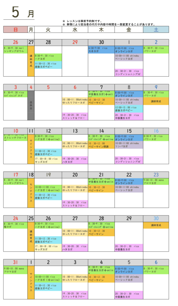 | ヨガ料金 | 5,500円/5回/2ヶ月 |